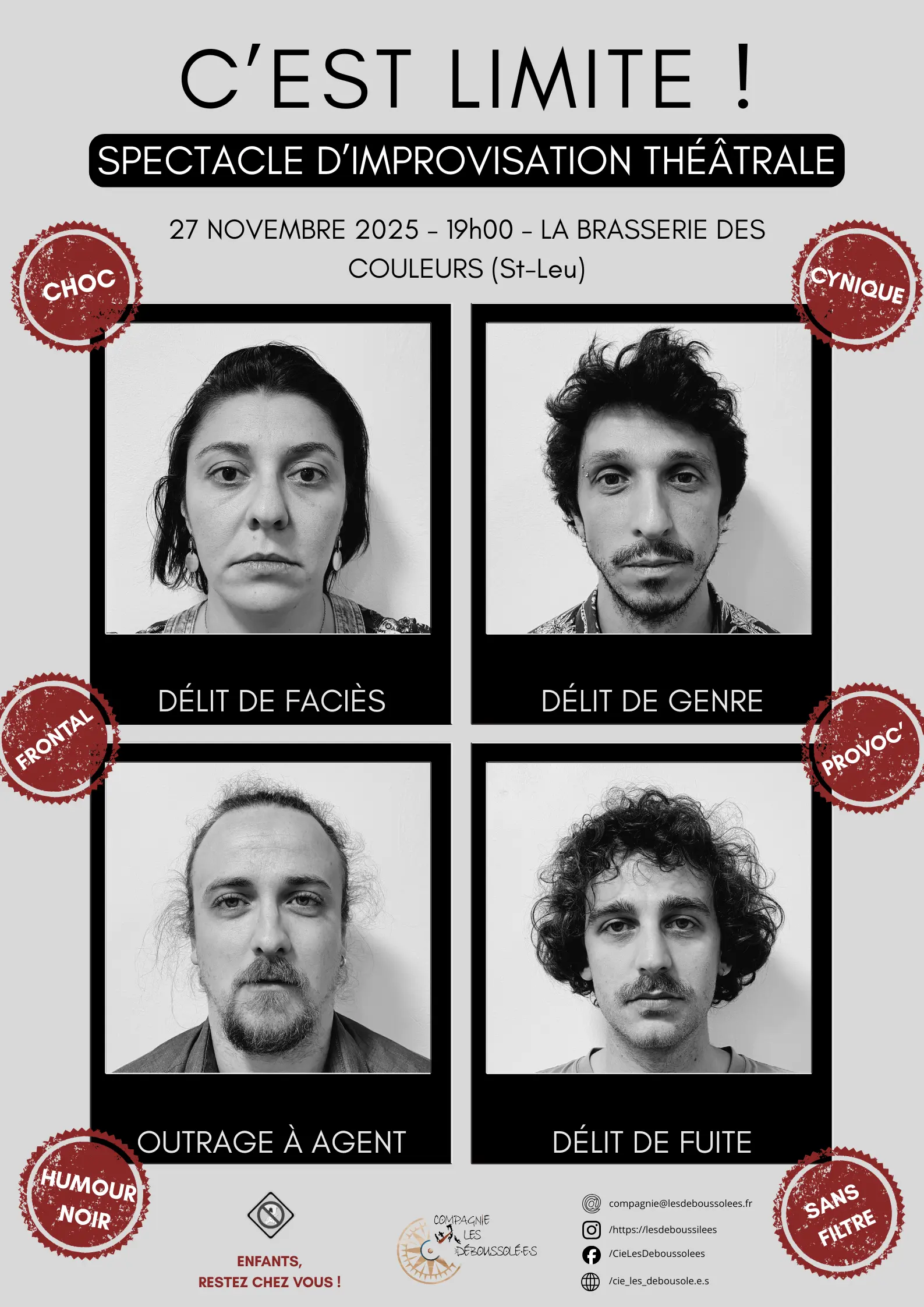 4 improvisateur·rice·s vont, pendant plus d’une heure, venir frôler toutes les limites du convenable, de l’admissible, du tolérable. Il vont creuser, jusqu’au plus profond, la provocation mais pour en faire ressortir le plus de rires ! Par chance, dès que cela devient trop limite pour vous : vous pouvez arrêter l’impro en cours et une autre verra le jour. Ne pensez pas venir voir un spectacle vulgaire ou grivois. Laissez quand même vos enfants à la maison pour ces improvisations qui viennent étaler ce qu’on ne devrait peut-être pas dire tout haut. Clichés, racisme, corruption, sujets tabous, tout peut y passer !